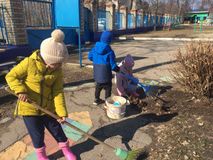 Погода радовала: яркое, теплое солнце, безветренный весенний день, а значит – хорошее настроение, работается легко и весело. В назначенное время педагоги и старшие дошкольники вышли на построение на площадку перед центральным входом детского сада, чтобы определить последовательность трудовых действий и фронт работы. Девчонки и мальчишки вооружились вениками и ведёрками для мусора. И работа закипела. Судя по боевому настрою, они были готовы приложить все усилия для того, чтобы участок и территория садика засияла чистотой. Дети работали сообща: одни собирали ветки, другие следом выносили мусор, дружно убирали старые листья из-под кустарников. Каждому хотелось внести свою лепту в общее дело и быть полезным. Несмотря на усталость, все были довольны наведенным порядком.