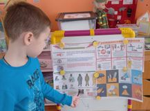 Старшие дошкольники рассмотрели иллюстрации «Гражданская оборона- сумей себя защитить», «Профессия спасатель». В процессе бесед дети узнали, о действиях населения по сигналам оповещения гражданской обороны, о правилах пожарной безопасности, безопасности людей на водных объектах и правилах оказания первой помощи. Воспитатели ещё раз напомнили ребятам телефоны экстренных служб.